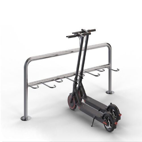 Statīvs 8 skrejriteņiem (stiprināms pie pamatnes), 1700x320x800mm. Stāvvietu skaits: 8 gab. Statīva / turētāja platums: 170 cm. Augstums: 80 cm. Attālums starp stāvvietām: 21 cm. Materiāls: cinkots tērauds. Konstrukcijas elementi: stienis Ø 12 mm, caurule Ø 48,3 mm. Stiprināšanas veids: stiprināšana pie pamatnes ar 6 izplešanās dībeļiem Ø 8 × 80 mm un skrūvēm Ø 6 × 80 mm (iekļauti komplektā), paredzēti atslēgai SW10 vai T30 vai betonēšanai 30 cm dziļumā.