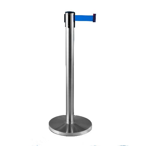 Nerūsējošā tērauda statīvs ar izvelkamu lentu. Matēta apdare statīvam ar pamatni. Stabils. Izmēri: statīva augstums 910mm, statīva d=63mm, pamatnes d=320mm (betona pildīta), izvelkamās lentas platums 48mm, lentas garums 2.7m. Lentas pieejamās krāsas: sarkana, melna, zila. Svars: 8kg.