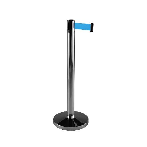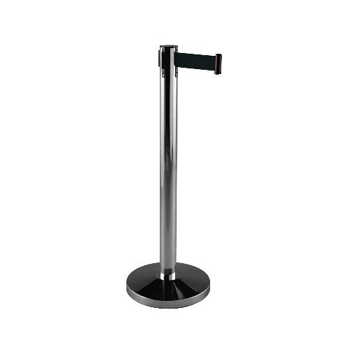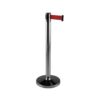 Nerūsējošā tērauda statīvs ar izvelkamu lentu. Pulēta apdare. Stabils. Izmēri: statīva augstums 910mm, statīva d=63mm, pamatnes d=320mm (betona pildīta), izvelkamās lentas platums 48mm, lentas garums 2.7m. Lentas pieejamās krāsas: zila, sarkana, melna. Svars: 8kg.