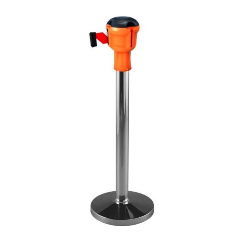 Nerūsējošā tērauda statīvs ar izvelkamu lentu plastmasas korpusā. Pulēta apdare statīvam. Stabils. Izmēri: statīva augstums 1035mm, statīva d=63mm, pamatnes d=350mm (betona pildīta), izvelkamās lentas platums 48mm, lentas garums 9m, lentas korpusa krāsa: oranža vai dzeltena. Lentas pieejamās krāsas: sarkanbalta, dzeltenmelna. Svars: 10kg.