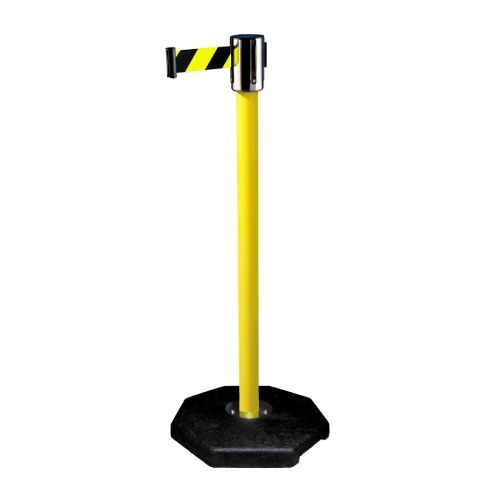 Nerūsējošā tērauda statīvs ar izvelkamu lentu un gumijas pamatni. Statīvs dzelteni krāsots RAL 1003. Stabils. Izmēri: statīva augstums 1035mm, statīva d=50mm, pamatnes d=400mm izvelkamās lentas platums 48mm, lentas garums 4.5m. Lentas pieejamās krāsas: dzeltenmelna, dzeltena, sarkana, sarkanbalta, melna. Svars: 9kg.