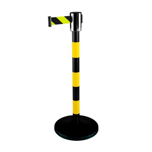 Nerūsējošā tērauda statīvs ar izvelkamu lentu. Statīvs melni krāsots RAL 9005 ar dzeltenām joslām. Stabils. Izmēri: statīva augstums 1035mm, statīva d=50mm, pamatnes d=320mm/350mm, izvelkamās lentas platums 48mm, lentas garums 2.7m. Lentas pieejamās krāsas: dzeltenmelna, dzeltena, sarkana, sarkanbalta, melna. Svars: 9kg.
