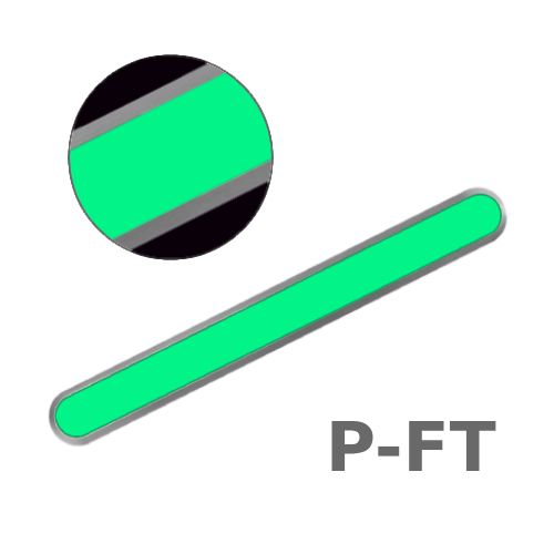 Taktila elements P-FT (taustes indikators). Garens, fotoluminiscējošs – tumsā spīd 8-10h. Izmantošanas laiks: aptuveni 12-24 mēneši. Metināta tapa (pieejams arī ar presētu tapu, bez tapas, pašlīmējošie varianti bez tapām). R10 pretslīdes klase. Izmērs: garums 280mm, platums 40mm, virsmas augstums 2.7mm. Pielieto kā vājredzīgo vadlīniju elementu. Nodrošina taustes marķējumu zonas uz virsmām, lai brīdinātu neredzīgus, vājredzigus cilvēkus, palīdz bez citu cilvēku palīdzības orientēties un droši pārvarēt viņu ceļā esošos traucēkļus. Taktila elementus izmanto iekštelpu zonām, kāpnēm, koridoriem u.c. Izgatavots no nerūsējošā tērauda (AISI 316L) un fotoluminiscējošā materiāla. Ūdensnecaurlaidīgs. Svars: 0.21kg.