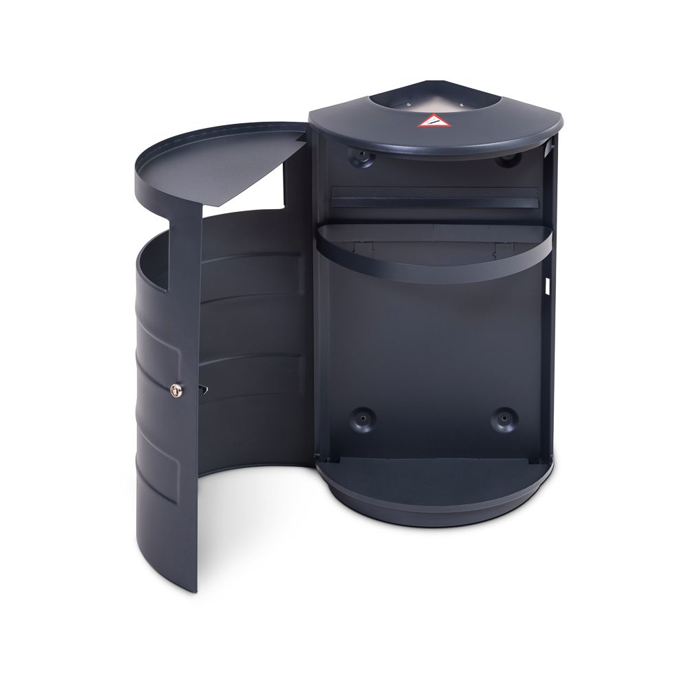 Tērauda atkritumu tvertne. Tilpums: 15L. Izmērs: 420x210x500mm. Atvērtne atkritumiem: 110x390mm. Vienpusējas durvis. Materiāls: cinkots tērauds (1mm). Nav perforēta. Ar uguns-drošības pelnu trauku augšpusē. Svars: 5.5kg.