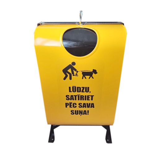 Tērauda atkritumu tvertne suņu ekskrementiem. Tilpums: 50l. Izmēri: platums 45cm, dziļums 31cm, augstums 80cm. Stiprināma pie pamatnes ar skrūvēm (neietilpst komplektā). Izgatavota no cinkotas loksnes. Pulverkrāsota. Aprīkota ar iekšējo tvertni un slēdzeni, kas neļauj to atvērt nepiederošām personām. Pieejama dažādās RAL krāsās (nepieciešamo toni precizēt pie pasūtīšanas). Piktogramma (ikona) ar tekstu – kādā no standarta piedāvātajiem variantiem vai pēc Jūsu vēlamā maketa. Ikona ar tekstu izgatavota no līmplēves.