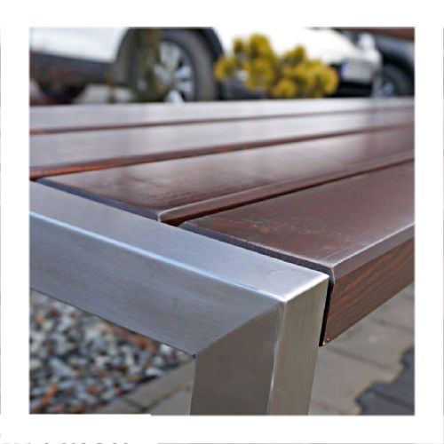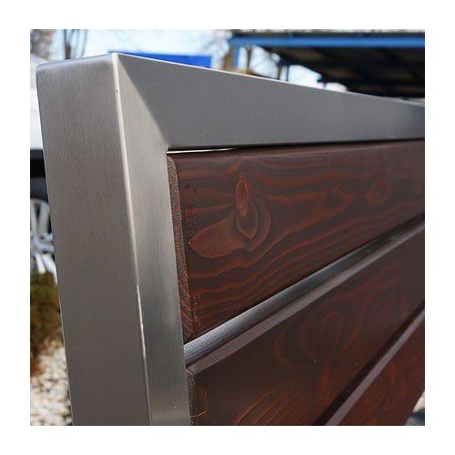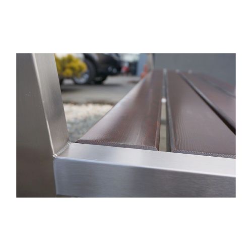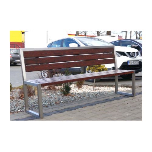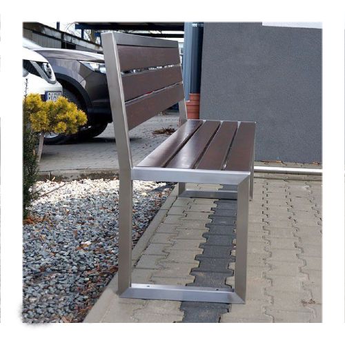 Tērauda soliņš ar atzveltni un koka dēlīšiem. Izmēri: koka dēlīšu garums: 1800mm, kopējais soliņa garums 1895mm, kopējais augstums 890mm, sēdekļa dziļums 405mm, platums 530mm, augstums līdz sēdeklim 450mm. Metāla detaļas cinkotas un krāsotas RAL tonī (pieejamie toņi: melns RAL 9005, grafīta pelēks RAL 7021, sudraba pelēks RAL 9006, brūns RAL 8011, zaļš RAL 6018). Pieejams arī nerūsējošā tērauda variants (pēc pieprasījuma). Pieskrūvējams pie pamatnes ar skrūvēm. Koka dēlīšu pieejamie toņi: gaišs ozols vai palisandrs (tumši brūns) – pēc izvēles. Koka dēlīšu izmērs: 1800x90x37mm. Metāla profila izmērs: 45x45mm. Foto metāla detaļas no nerūsejošā tērauda.