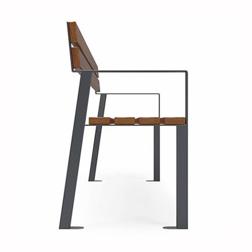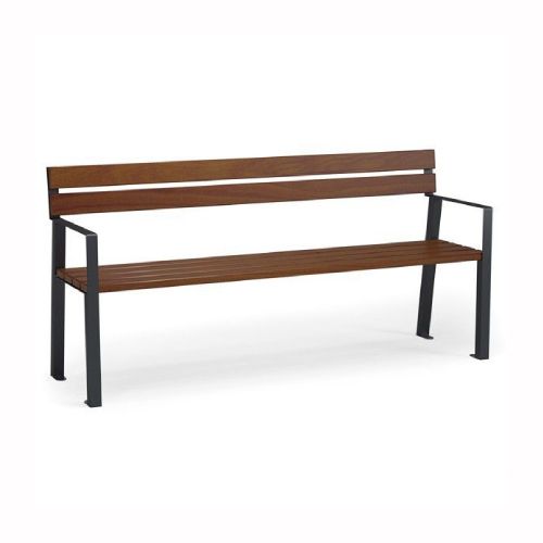 Tērauda soliņš ar atzveltni un roku balstiem. Izmēri: kopējais soliņa garums 1800mm, kopējais augstums 900mm, sēdekļa augstums 440mm, kopējais dziļums 550mm. Metāla detaļas cinkotas un krāsotas RAL tonī (pieejamie toņi: melns RAL 9005, grafīta pelēks RAL 7021, sudraba pelēks RAL 9006, pelēks RAL 9007, dzeltens RAL 1023, brūns RAL 8011, sarkans RAL 3002, zaļš RAL 6018, oranžs RAL 2000). Metālam 45x45x2mm profils (kājām) un roku balstiem – plakanais stienis 45x5mm. Pieejams arī nerūsējošā tērauda variants (pēc pieprasījuma). Pieskrūvējams pie pamatnes ar skrūvēm vai betonējams (pēc izvēles). Koka dēlīšu pieejamie toņi: gaišs ozols vai palisandrs (tumši brūns) – pēc izvēles. Skuju koka dēlīšu izmērs: 1800x90x37mm.