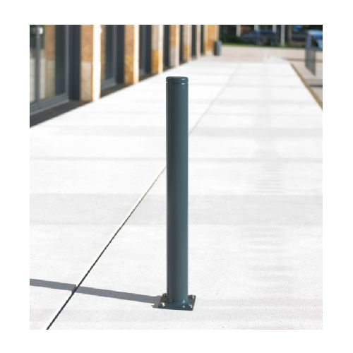 Tērauda stabs LEIPZIG ar alumīnija vāciņu. Betonējams. Izmēri: diametrs 90mm, augstums virs pamatnes 940mm, augstums zem pamatnes 300mm, caurules sieniņu biezums 2.9mm. Karsti cinkots un krāsots antracīta pelēkā tonī (RAL 7016). Par papildus samaksu iespējams stabs ar ķēdes cilpām. Svars: 8.7kg.