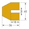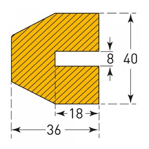 Trapecveida stūru aizsargs. Krāsa: dzeltena ar melnu. Izgatavots no poliuretāna putām. Izmēri: platums 40mm, augstums 36mm, garums 1000mm, iegriezuma gropes platums 8mm, iegriezuma gropes dziļums 18mm. UV staru izturīgs, elastīgs, nesatur silikonu. Temperatūras izturība no -40 grādiem līdz +100 grādiem pēc Celsija grādiem. Pielietojams gan ārā, gan iekštelpās. Ugunsdrošības klase: B2. Svars: 0.8kg.