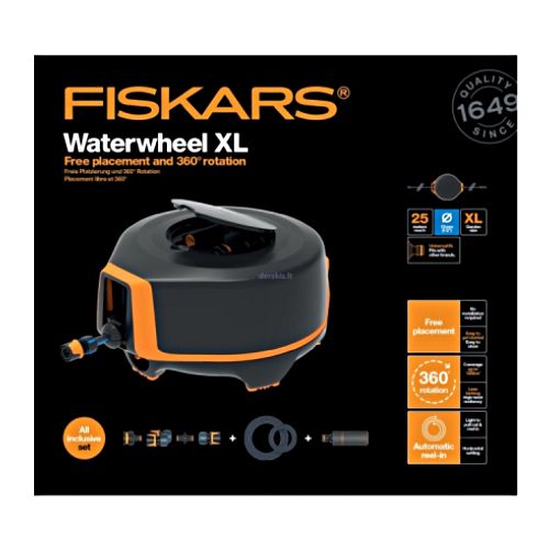 Universāls ūdensrats FISKARS Waterwheels XL. Ūdensratu XL var novietot jebkurā vietā dārzā, kas padara laistīšanu vieglu un patīkamu – neviens stūris / koks netraucēs šļūtenei. 360 grādu rotācija ļauj tuvoties jebkuram zāliena leņķim un paplašina laistīšanas laukumu līdz 1256 kv.m. Novatorisks horizontālais iestatījums padara neiespējamu tītavas apgāšanu izmantojot to dārzā. Automātiskā sarullēšana un visi nepieciešamie aksesuāri, ieskaitot savienotājus un laistīšanas uzgali, kuri tiek glabāti speciālajā ūdensrata nodalījumā. Ūdensrats ir kompakts un viegli uzglabājams. Sienas stiprinājums pieejams atsevišķi.