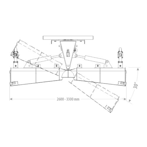 V-veida sniega lāpsta (smagā tipa). Lāpstas platums 2900mm, darba platums 2254-2940mm, lāpstas augstums 1082mm, lāpstas dziļums 1115mm. Gumijas naža izmērs: 175x50mm. Sniega lāpstas ribu biezums +/-8-10mm un karkasa metāla materiāla biezums +/-5mm. Lāpstas hidrauliska vadība. Noliecami asmeņi. Funkcija “sekošana zemei”. 30 grādu labais/kreisais darba leņķis. Papildus iespējams aprīkot ar LED apgaismojumu, atbalsta riteniem vai ar bīdāmajām sliedēm. Svars: 474kg.
