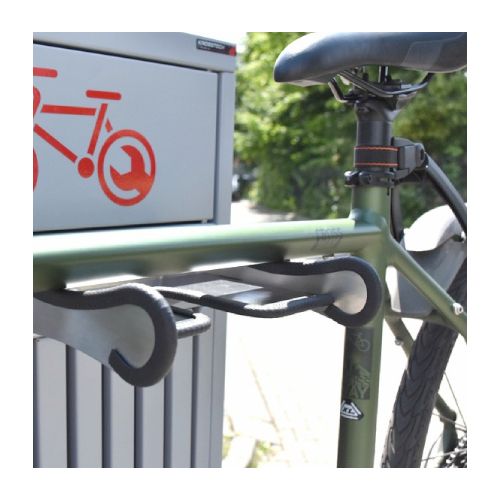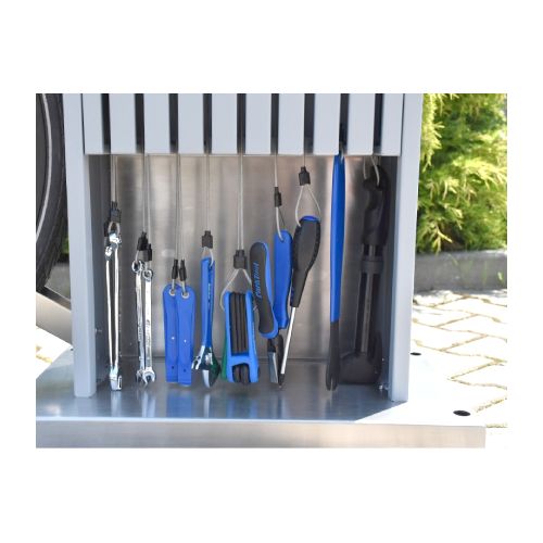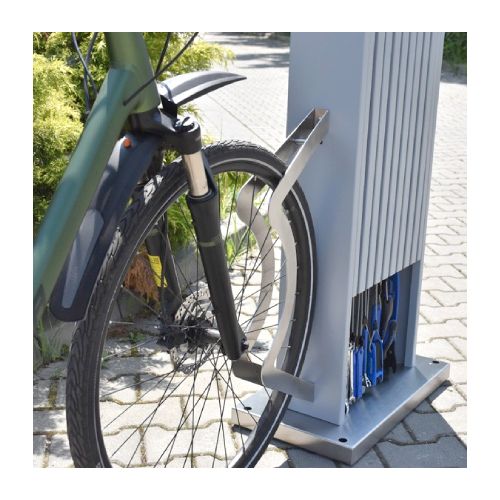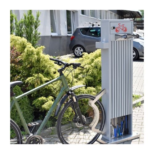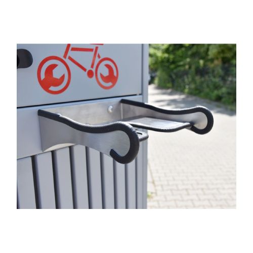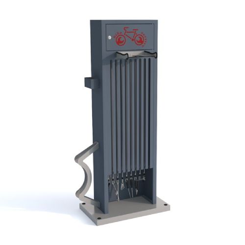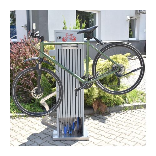 Velosipēdu remonta stacija. Universāla ierīce, ko izmanto, lai veiktu velosipēdu pamata remontdarbus. Noderīga sabiedriskās vietās, netālu no velo celiņiem, sporta un atpūtas objektiem, degvielas uzpildes stacijās, publiskajās auto mazgātuvēs u.c. vietās. Komplektā ietilpst instrumenti velo remontam – nerūsējošā tērauda skrūvgriezis uz grozāma savienotāja; uzgriežņu atslēgas (nerūsējošā tērauda 8×10/13x15mm); rokas pumpis; regulējama uzgriežņu atslēga 0-24mm; universālās knaibles; Torx atslēgas T7/T9/T15/T20/T25/T27/T30/T40; atslēgas 3mm/4mm/5mm/8mm/10mm; 2gab. speciālas atslēgas, kas paredzētas bezkameru riepu un spieķu riepu noņemšanai; 15mm uzgriežņu atslēga pedāļu piestiprināšanai. Visi instrumenti piekārti uz d=4mm nerūsējošā tērauda trosēm ar gumijas pārsegu). Izmēri: augstums 1600mm, platums 542mm (apakšējā daļā), platums 400mm (augšējā daļā), kopējais dziļums 462mm. Izgatavota no cinkota un krāsota tērauda RAL tonī: standarta toņi – grafīta pelēks RAL 7021 vai sudraba pelēks RAL 9006; citas krāsas – pēc pieprasījuma (iespējams arī nerūsējošā tērauda variants). Remonta stacija aprīkota ar nelielu magnētisko paplāti nelielu elementu (skrūvju, paplākšņu utt.) īslaicīgai uzglabāšanai.