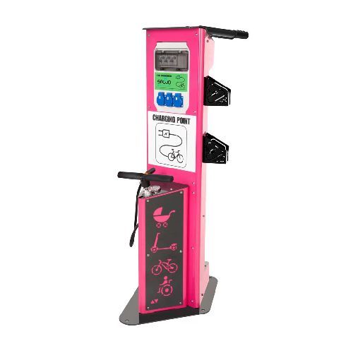 stacionārs rokas pumpis ar adapteri, kas paredzēts visu veidu velosipēdu ventīļiem (Presta, Schrader un Dunlop) – spiediena diapazons no 0÷10 BAR + glicerīna manometrs; nerūsējošā tērauda troses FI4 ar melnu gumijas pārklājumu; 3 uzlādes ligzdas elektrisko velosipēdu uzlādēšanai; 2 konteineri viedtālruņa vai citu lietu uzglabāšanai. Var izvēlēties krāsu no RAL paletes.
