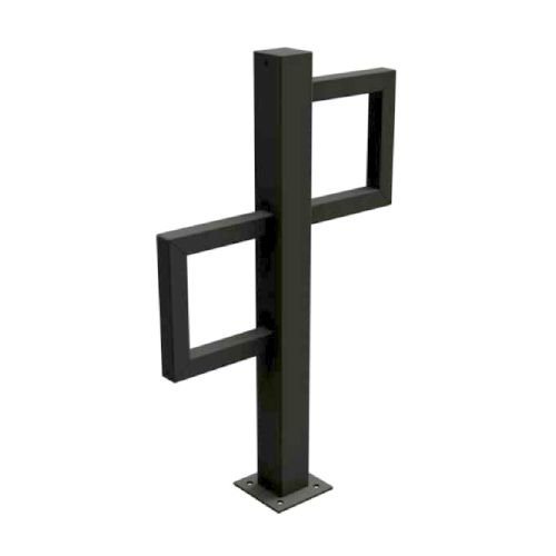 Velosipēdu statīvs 1 velosipēdam. Karsti cinkots un matēti melni krāsots. Izmēri: augstums 800mm, pamata plāksne 150x150mm. Izgatavots no 80x80mm kvadrātcaurules un 60x60mm kvadrātcaurulēm sānos. Stiprināms pie zemes ar 4 skrūvēm. Svars: 11.5kg. Pieejams arī tikai karsti cinkots velosipēdu statīvs.