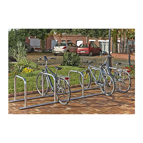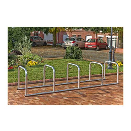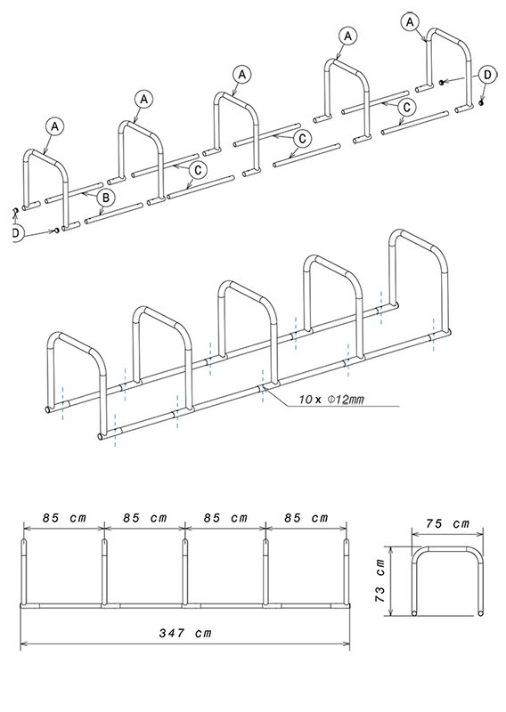 Velosipēdu statīvs 10 velosipēdiem (U-veida). Izmēri: garums 347cm, augstums 70cm. Attālums starp centra līnijām: 85cm. Izgatavots no d=50mm cinkota tērauda caurulēm. Pamatnes cauruļu d=45mm. Pie katra U-veida loka viena cilpa (kopā 5 cilpas).