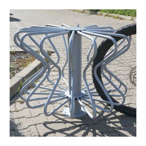 Velosipēdu statīvs FLOWER. Paredzēts 16 velosipēdu novietošanai. Interesants dizains, kas atgādina puķes ziedlapiņas. Stiprināms pie pamatnes ar skrūvēm vai betonējams (nepieciešamo montāžas veidu var izvēlēties). Materiāls: cinkots tērauds, iespējams krāsot RAL tonī vai izgatavot no nerūsējošā tērauda par papildus samaksu. Iespējamie RAL toņi: melna RAL 9005; grafīta pelēka RAL 7021; sudraba pelēka RAL 9006; brūna RAL 8011; dzeltena RAL 1023; zaļa RAL 6018; sarkana RAL 3002; oranža RAL 2000. 1.foto redzams statīvs no nerūsējošā tērauda.