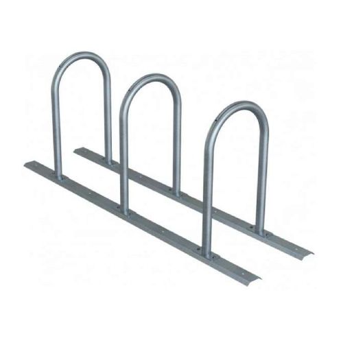 Velosipēdu statīvs 3 velosipēdiem ar sliedi piestiprināšanai. Karsti cinkots. Izmēri: augstums 800mm, kopējais garums: 2100mm, dziļums 460mm, atstatums no stīpām ~700mm. Izgatavots no d=48mm liektām caurulēm. Stiprināms pie zemes ar skrūvēm. Svars: 30.5kg.
