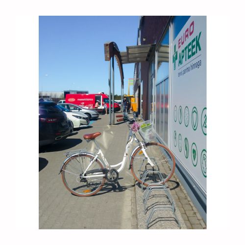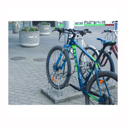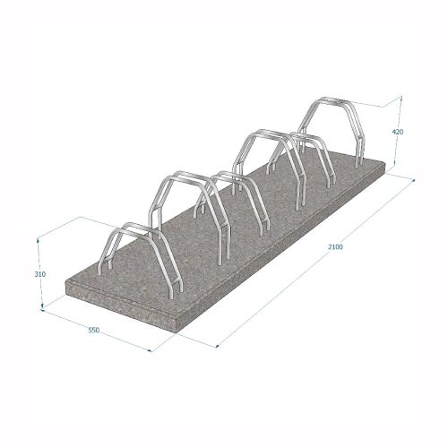Velosipēdu statīvs 6 velosipēdiem ar betona pamatni. Izgatavots no betona pamatnes ar metāla turētājiem. Piemērots 6 velosipēdiem. Velosipēdus iespējams novietot 2 līmeņos. Izmēri: garums 2100mm, platums 550mm, augstums 310mm-420mm. Svars: 200kg. Iespējamie betona toņi: P101, P103, P106.