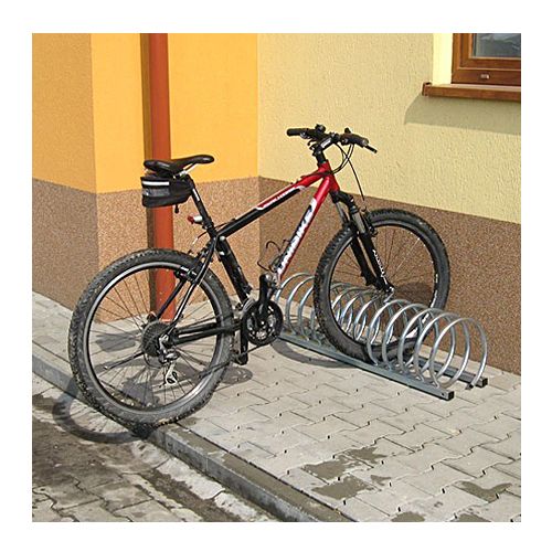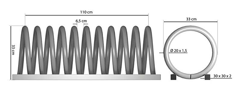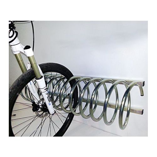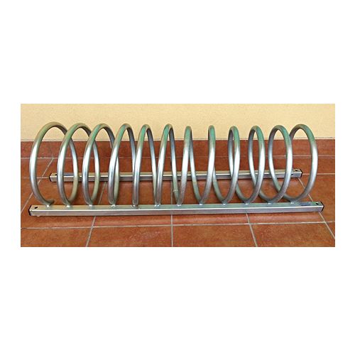 Spirālveida velosipēdu statīvs. Paredzēts 4 velosipēdu novietošanai. Cinkots, iespējams krāsot par papildu samaksu.Izmēri: garums 110cm, dziļums 33cm, augstums 33cm, attālums starp mietturiem 6,5cm. Svars: 10,6kg.