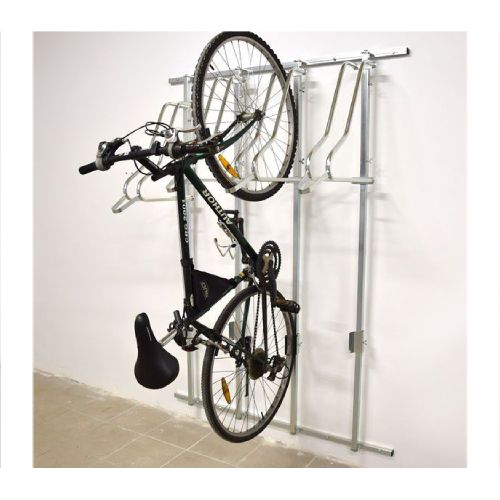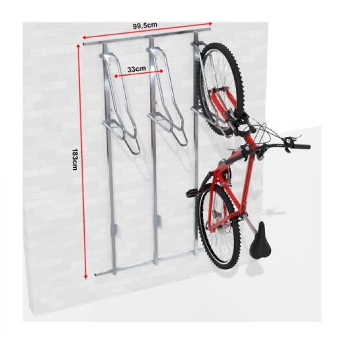 Velosipēdu statīvs WALL PREM 3 ar atbalsta profiliem riepas platumam līdz 55mm. Paredzēts trīs velosipēdu novietošanai pie sienas. Regulējams gan vertikāli, gan horizontāli – tas ļauj pielāgot statīvus izvietot atbilstoši savām vēlmēm. Kopēja atbalsta konstrukcija, kas atvieglo montāžu pie sienas. Maksimālā pieļaujamā slodze: 30kg. Stiprināms ar skrūvēm (komplektā). Komplektā arī stiprinājums aizmugurējai riepai (novērš sienu nosmērēšanos un stabilizē velosipēdu). Materiāls: cinkots tērauds. Izmēri: statīva dziļums 500mm, platums 995mm (montāžas profils 25x25x1.5mm), statīva vadotnes garums 1800mm (profils 25x25x1.5mm), caurules šķērsgriezums d=18mm, caurules biezums 2mm, attālums starp velosipēdiem 330mm. Statīvs paredzēts riepas platumam līdz 29×2.2 collām (5.5cm platums); pieejams arī variants līdz 29×3.15 collām (8cm platums), saderība ar bremžu diskiem līdz d=203mm. Konkrētais modelis bez speciāla roktura (par papildus samaksu pieejams ar speciālo rokturi, kas paredzēts velosipēda pieslēgšanai pie rāmja). Par papildus samaksu iespējams arī nerūsējošā tērauda variants. Svars: 15kg.
