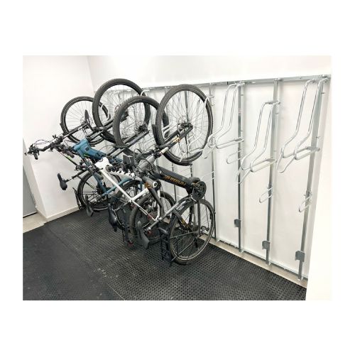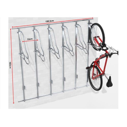Velosipēdu statīvs WALL PREM 6 ar atbalsta profiliem riepas platumam līdz 55mm. Paredzēts sešu velosipēdu novietošanai pie sienas. Regulējams gan vertikāli, gan horizontāli – tas ļauj pielāgot statīvus izvietot atbilstoši savām vēlmēm. Kopēja atbalsta konstrukcija, kas atvieglo montāžu pie sienas. Maksimālā pieļaujamā slodze: 30kg. Stiprināms ar skrūvēm (komplektā). Komplektā arī stiprinājums aizmugurējai riepai (novērš sienu nosmērēšanos un stabilizē velosipēdu). Materiāls: cinkots tērauds. Izmēri: statīva dziļums 500mm, platums 1985mm (montāžas profils 25x25x1.5mm), statīva vadotnes garums 1800mm (profils 25x25x1.5mm), caurules šķērsgriezums d=18mm, caurules biezums 2mm, attālums starp velosipēdiem 330mm. Statīvs paredzēts riepas platumam līdz 29×2.2 collām (5.5cm platums); pieejams arī variants līdz 29×3.15 collām (8cm platums), saderība ar bremžu diskiem līdz d=203mm. Konkrētais modelis bez speciāla roktura (par papildus samaksu pieejams ar speciālo rokturi, kas paredzēts velosipēda pieslēgšanai pie rāmja). Par papildus samaksu iespējams arī nerūsējošā tērauda variants. Svars: 30kg.